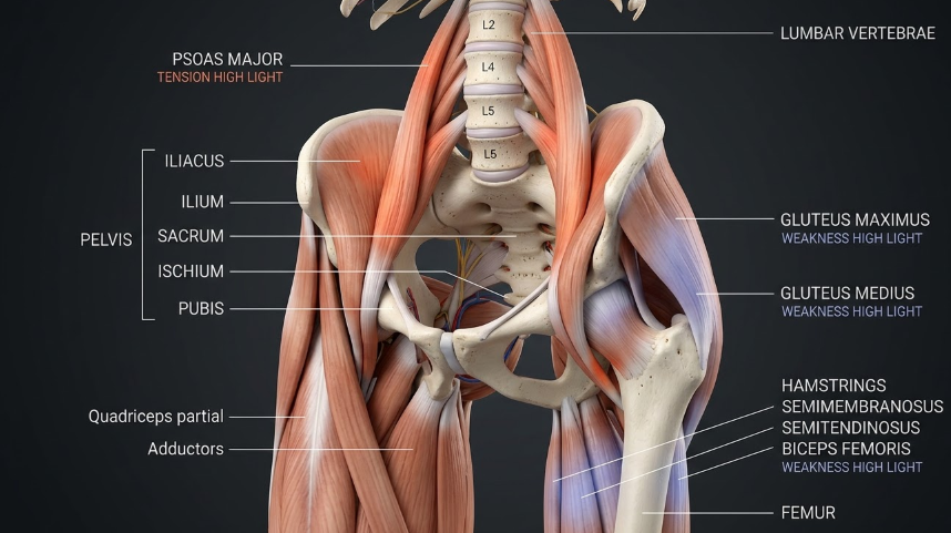 가장 큰 원인은 특정 근육의 단축과 약화입니다. 주로 장시간 앉아 생활하는 분들은 다리를 위로 들어 올릴 때 사용하는 장요근(허리뼈와 허벅지뼈를 잇는 근육)이 짧게 수축하게 됩니다. 이 근육이 골반을 앞으로 잡아당기면서 전방경사가 시작됩니다.