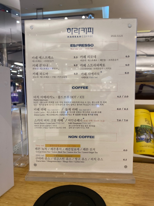 하라커피는 품질 높은 커피와 세련된 분위기로 이미 많은 사람들의 사랑을 받고 있는 카페입니다. 쇼핑 중에 잠시 들러 맛있는 커피를 즐기며 쉬어가기 딱 좋은 곳입니다.