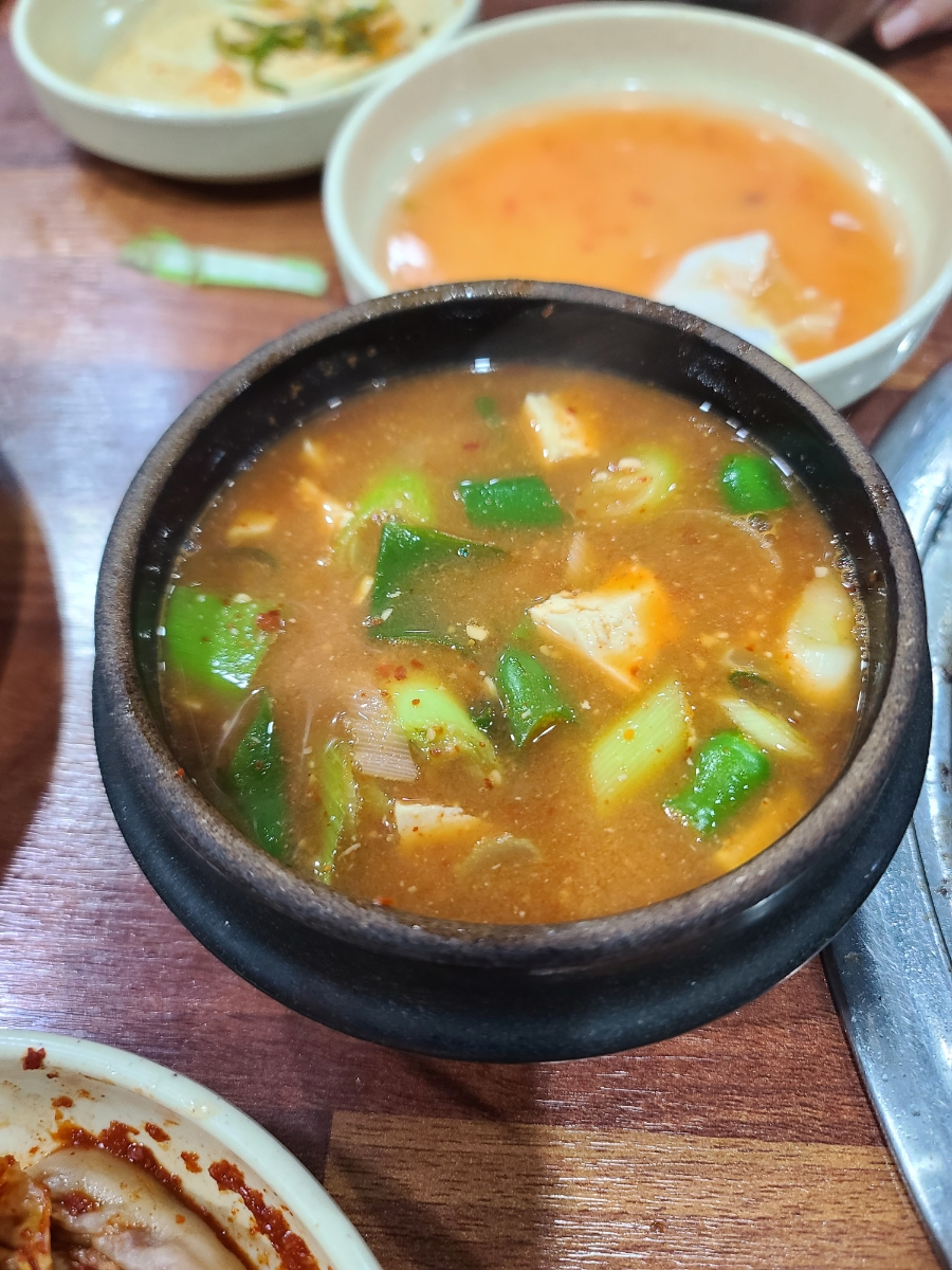 공깃밥을 주문할 때 된장찌개도 함께 요청했지만, 한참이 지나도 나오지 않았습니다. 아마도 테이블이 많아서 주문이 밀린 것 같았어요. 우리 테이블이 마지막 주문이었는지 꽤 오랜 시간이 지나서야 된장찌개가 나왔습니다.