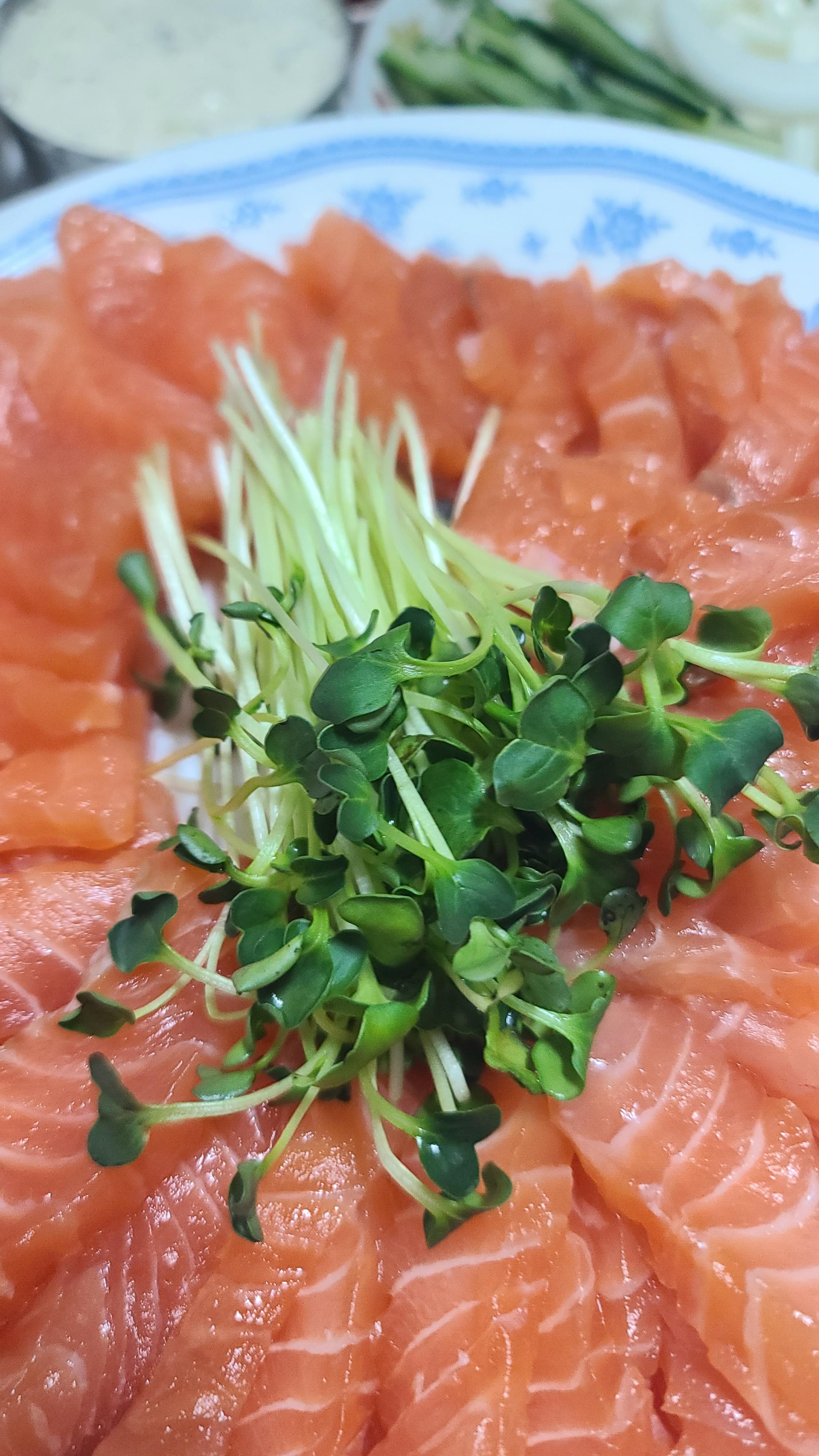 - 양파 슬라이스: 얇게 썬 생양파를 함께 먹으면 아삭한 식감과 함께 연어의 맛이 더 살아나요.