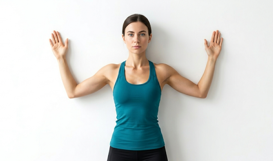 벽을 활용한 '월 슬라이드(Wall Slide)' 운동을 추천합니다. 벽에 등과 엉덩이를 대고 선 상태에서 양팔을 'W'자 모양으로 만듭니다. 팔꿈치와 손등이 벽에서 떨어지지 않도록 유지하며 천천히 위로 밀어 올렸다가 내리는 동작입니다. 이 과정에서 견갑골(날개뼈) 사이의 근육이 수축되는 것을 느껴야 합니다.